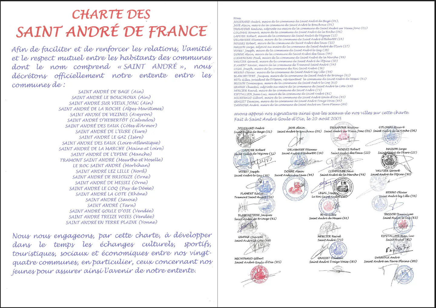 À l’occasion d’un rassemblement, les communes participantes signent une charte des Saint André de France. Ce document formalise l’amitié, la solidarité et l’entraide entre les habitants des communes qui partagent ce même nom.
